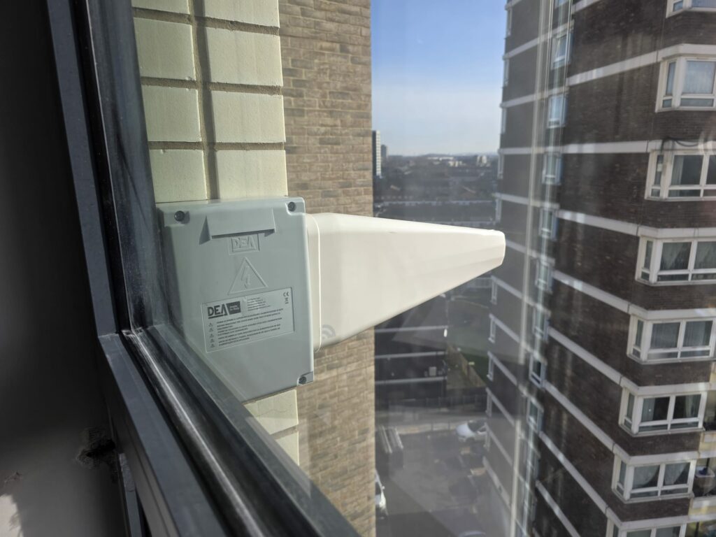 The TestTool survey results indicated that the 6th floor provided the most suitable signal levels across all operators. The external Yagi antenna was therefore installed at the 6th-floor level to capture the strongest available outdoor signal.